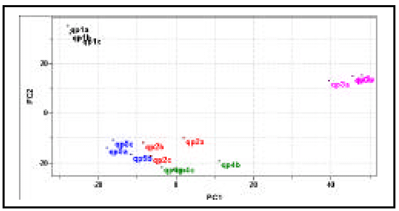 Figura 1. Gráfico de Scores (PC1xPC2. 32,2% e 23,2% respectivamente) das amostras analisadas.